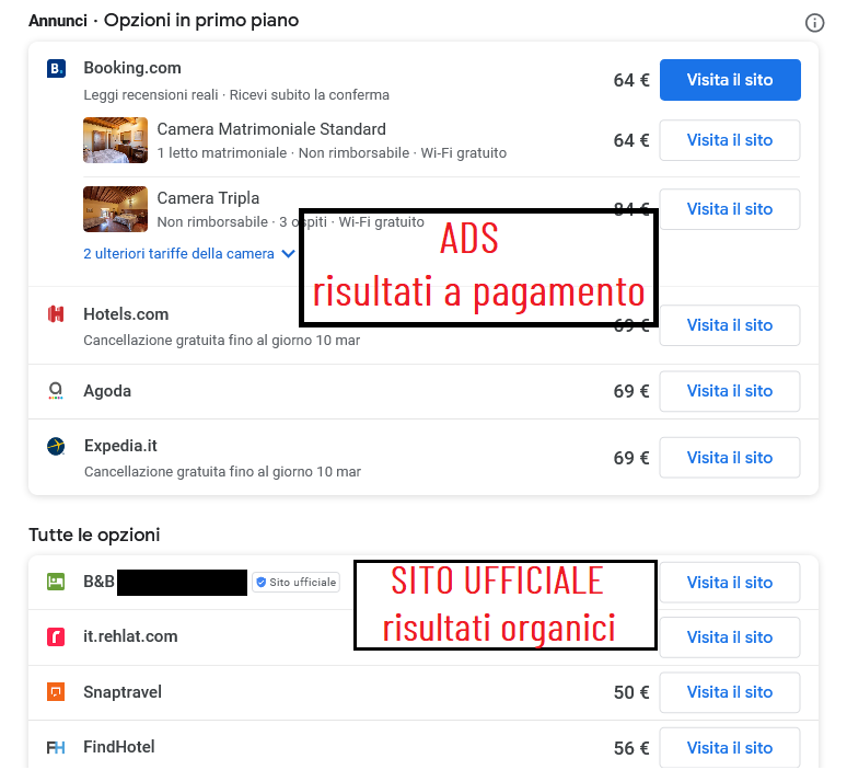 - il secondo blocco, posto immediatamente sotto, è denominato “tutte le opzioni” e mostra i risultati organici, ovvero le tariffe dell’hotel senza una relativa campagna pubblicitaria.