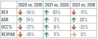 Confrontando il 2021 con il 2019, l’ADR registra un aumento del 28% a fronte di un calo del revenue dell’11%. Bisogna però sempre tenere presente che la stagione 2021 ha registrato un -10% di camere disponibili alle vendite rispetto alla stagione 2019. Pertanto, in termini ponderali, la produzione 2021 risulta totalmente allineata a quella del 2019. Un recupero davvero da record!