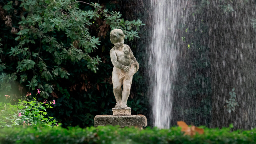 Sul lato est, il porticato impreziosito da colonne romane e la fontana ravvivata da graziosi putti in pietra.